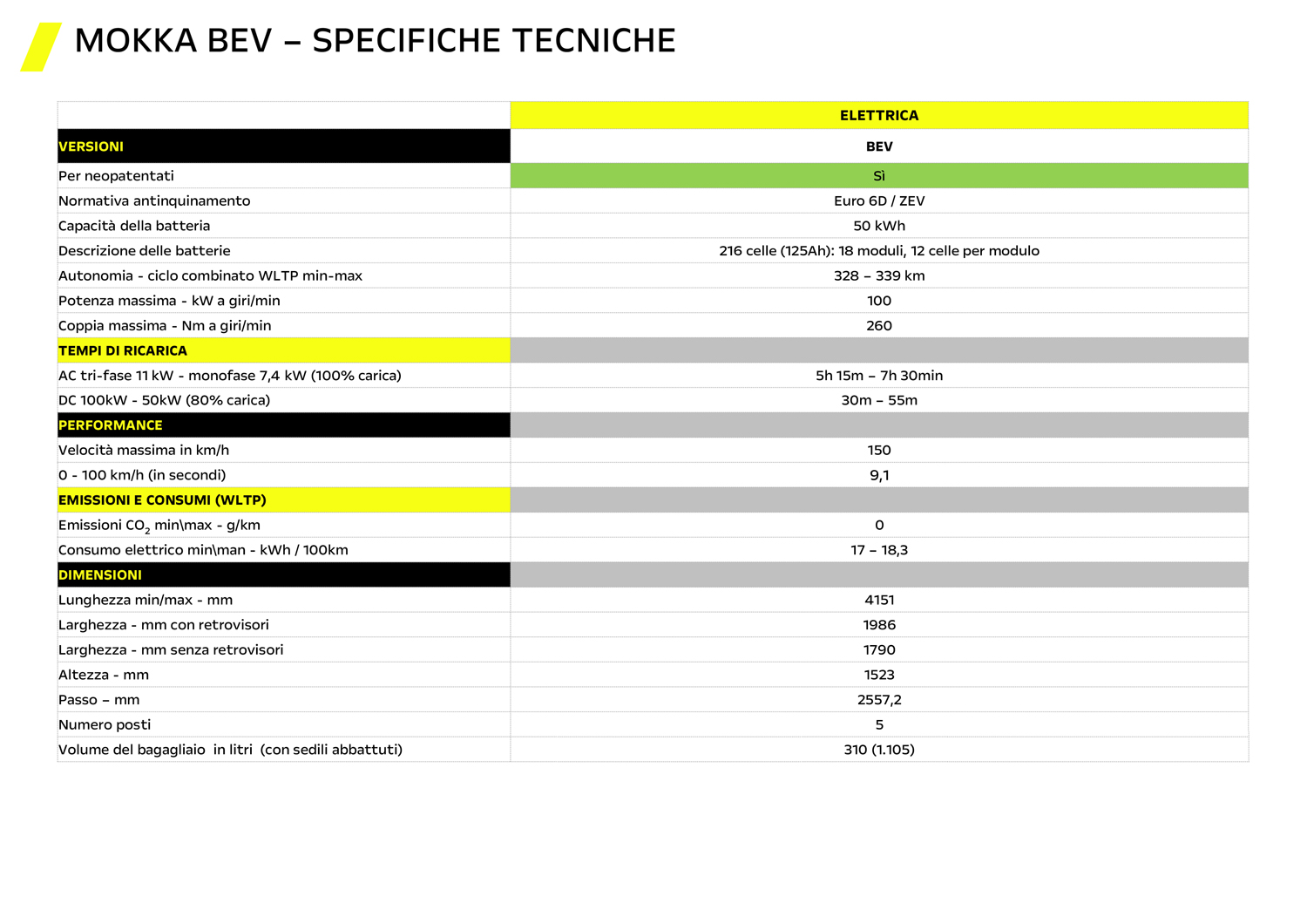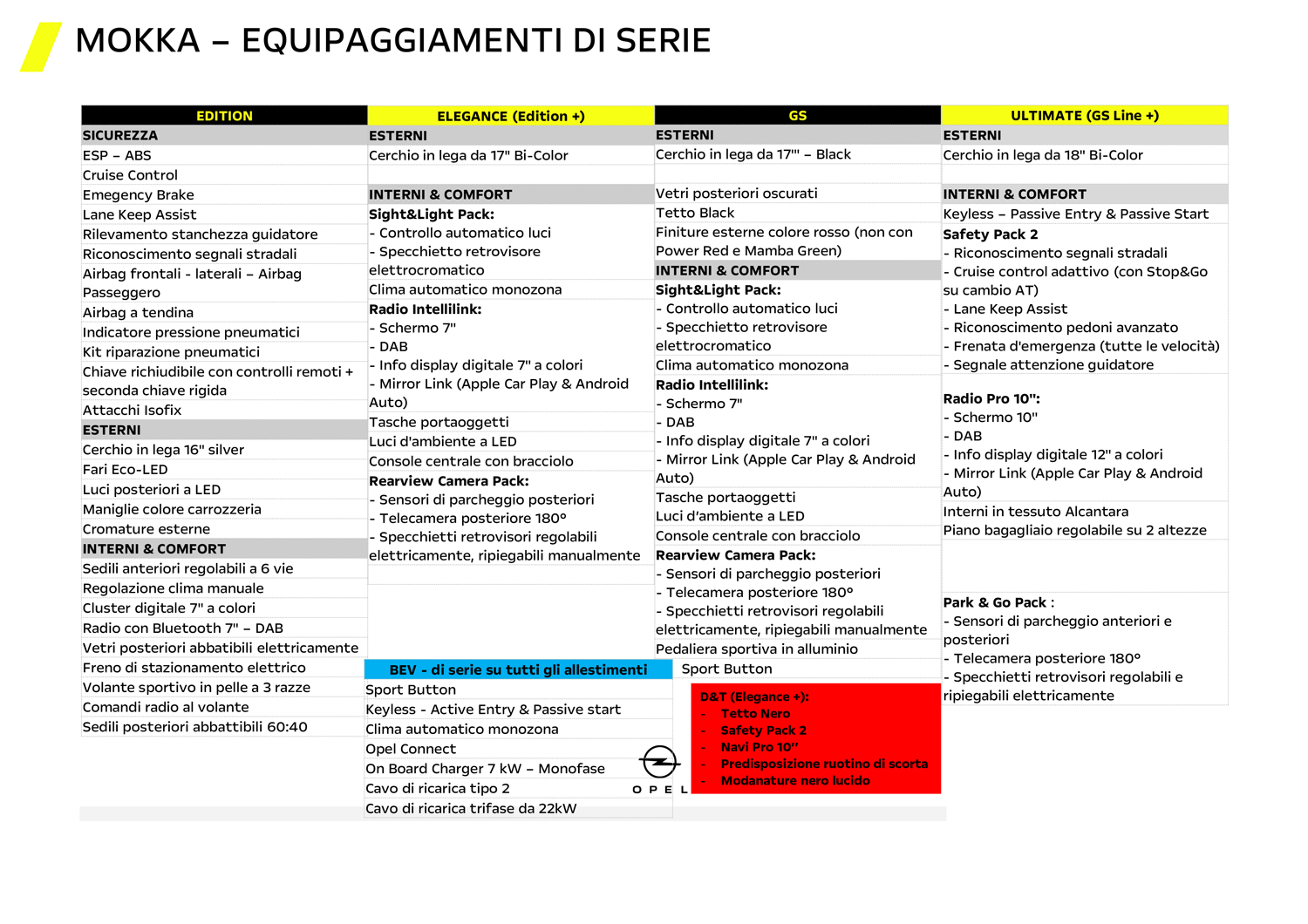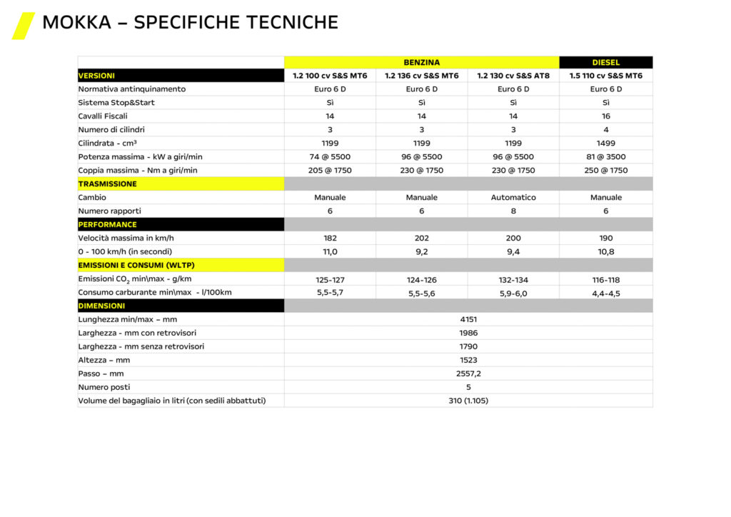 Il crossover della Opel rimane disponibile sia nelle varianti endotermiche a benzina o diesel, sia nella versione elettrica e-Mokka, con dotazioni dedicate e motore da 100 kW.